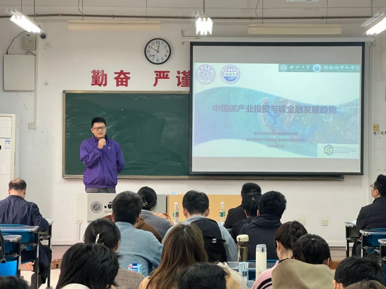 李政围绕碳中和产业投资与绿色金融发展趋势、国际碳金融碳交易市场发展经验、碳足迹与碳数据体系、绿色供应链、气候投融资风险等方面展开报告。他指出,碳中和行动是全球应对气候变化的共识性策略,应对气候变化与未来产业转型,需要靠人才和科研技术手段实现,希望同学们充分利用专业优势,踏实做好碳中和技术研究,以实际行动参与“双碳”行动,努力成为应对气候治理的专业人才。