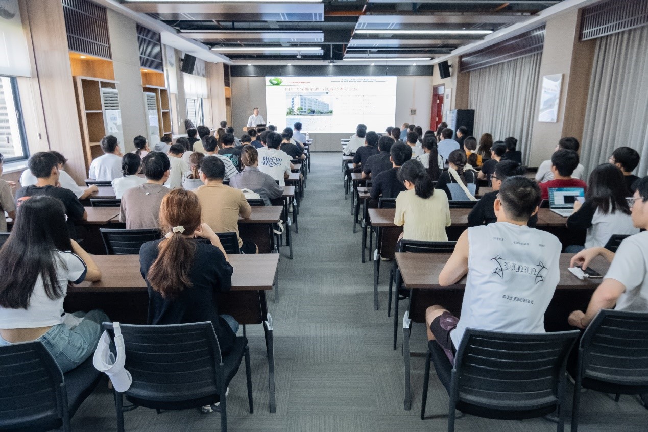 梁斌教授首先介绍了四川大学新能源与低碳技术研究院的主要研究方向,随后重点介绍了研究院在CO₂捕集技术和CO₂矿化技术近十多年来的研究成果。梁斌教授分享了团队研究过程中瞄准国家和社会需求、解决实际问题、探寻科学规律、推动技术进步的具体实践,生动细致地剖析了“发现问题、分析问题、解决问题”科研过程,开阔了与会师生的科研视野,坚定了同学们投身科研、服务国家“双碳”战略的信心和决心。