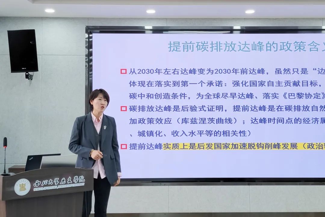 王璟珉首先介绍了山东财经大学中国国际低碳学院的基本情况,随后,她从国家“双碳”战略目标的理论缘起出发,系统梳理了应对气候变化、实现绿色低碳可持续发展的科技支撑、政策定位、以及经济学、哲学和政治基础。她详细讲述了人类对气候变化认知的深化过程以及中国在碳达峰碳中和进程中的探索与实践,分析了未来应对气候变化的发展趋势与走向。她鼓励大家能够紧跟时代潮流,拓宽国际视野,为我国在全球气候治理中发挥引领作用而努力奋斗。