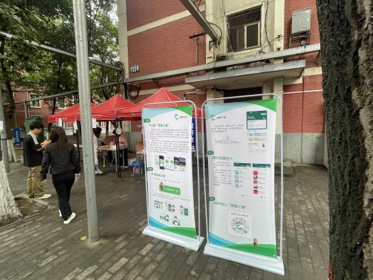 同时,校园宣传活动也在如火如荼地进行,展位前人头攒动。现场工作人员发放低碳知识宣传册和碳普惠宣传册,并为感兴趣的员工讲解陕西省“碳惠三秦”碳普惠平台,介绍碳普惠积分获取方式(每日任务、绿色场景)及可兑换权益(低碳商城)。