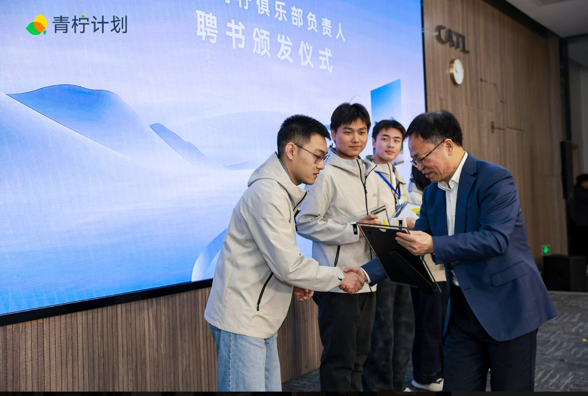 员工社团成立环节,联盟高校领导代表马新宾、赖海榕、刘晨江及宁德时代人才引进与发展资深总监张洋分别为公司和清华大学、同济大学等近20所高校的“青柠俱乐部”员工代表颁发聘书。