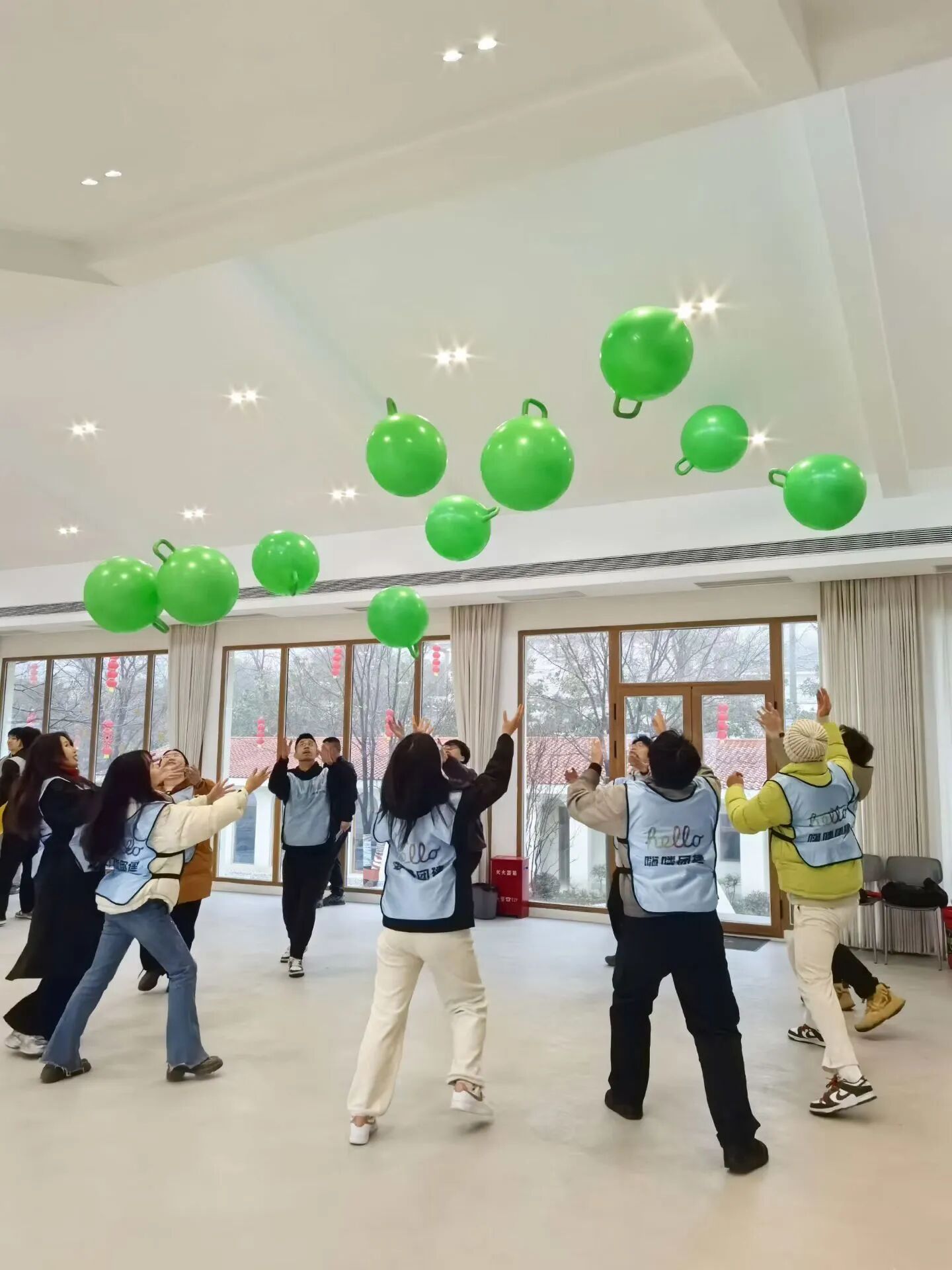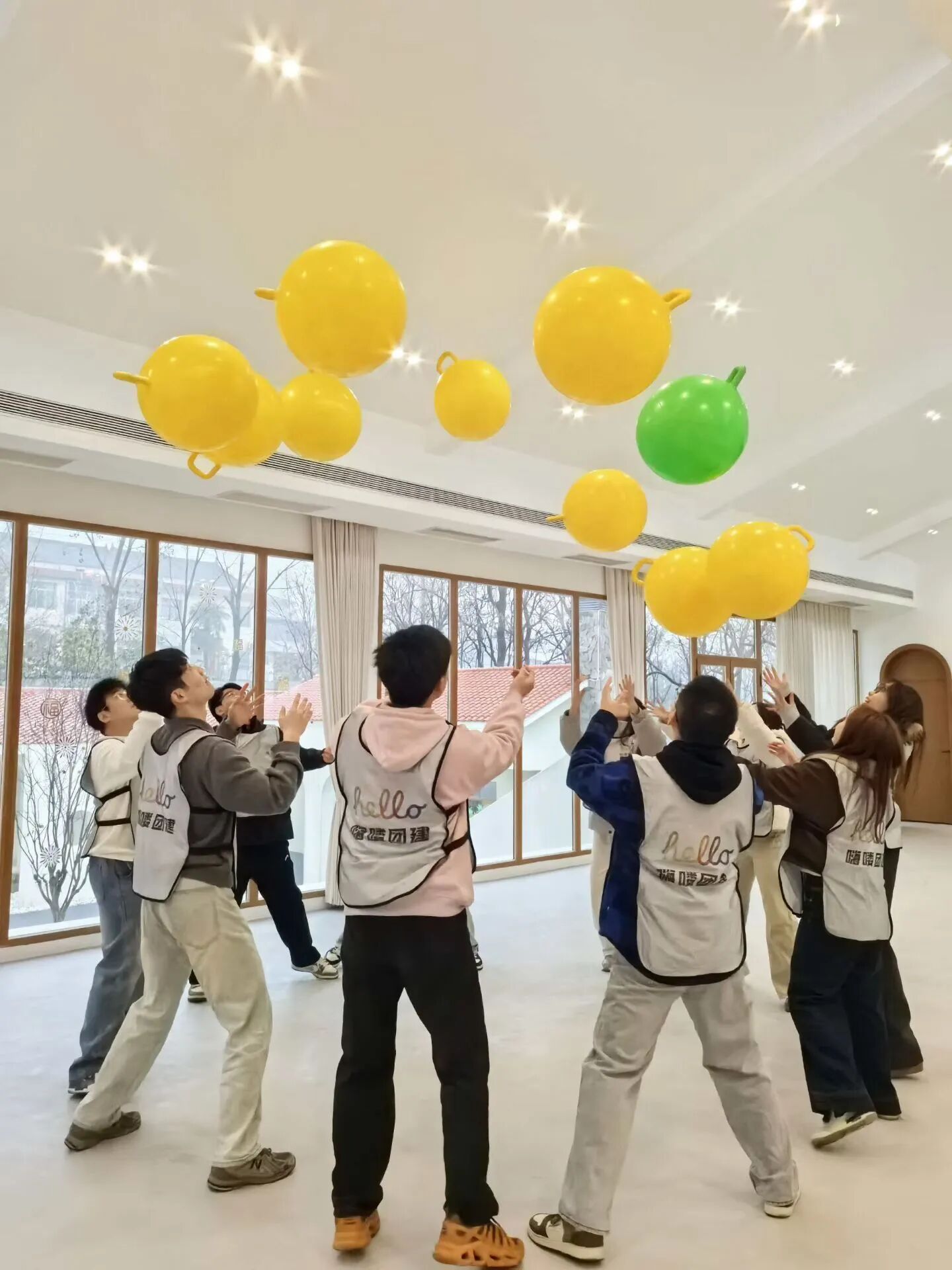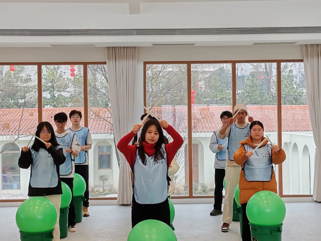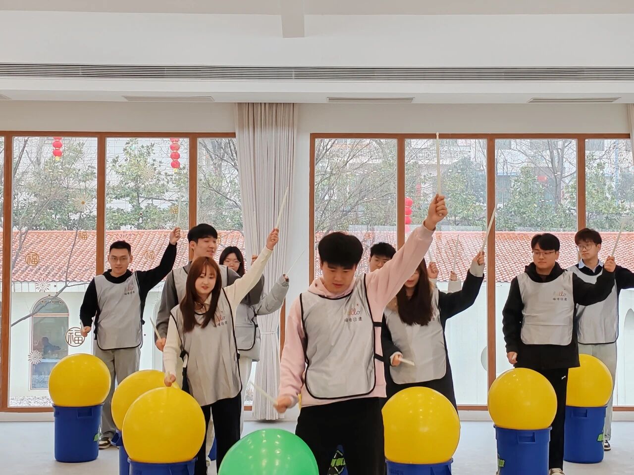 在教练的带领下,同学们手持鼓槌,跟随动感音乐,通过跳跃、敲击等动作完成团队合奏。大家互相协作、默契配合,在节奏与汗水中感受团队的力量,现场气氛热烈欢快。
