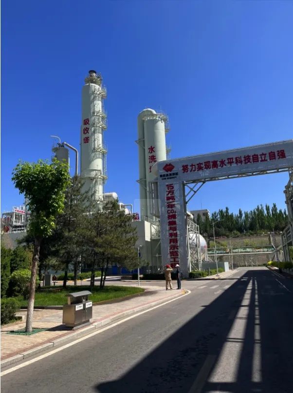 12日下午,实践小组前往横山区榆横工业园区参观调研榆林城投佰盛二氧化碳综合利用项目。该项目利用中煤陕西榆林能源化工有限公司产生的高浓度二氧化碳,通过二氧化碳捕集技术实现工业废气回收再利用。实践调研小组重点从二氧化碳捕集与存储装置的运行流程以及二氧化碳相关利用以及下游转化途径等方面进行交流学习。