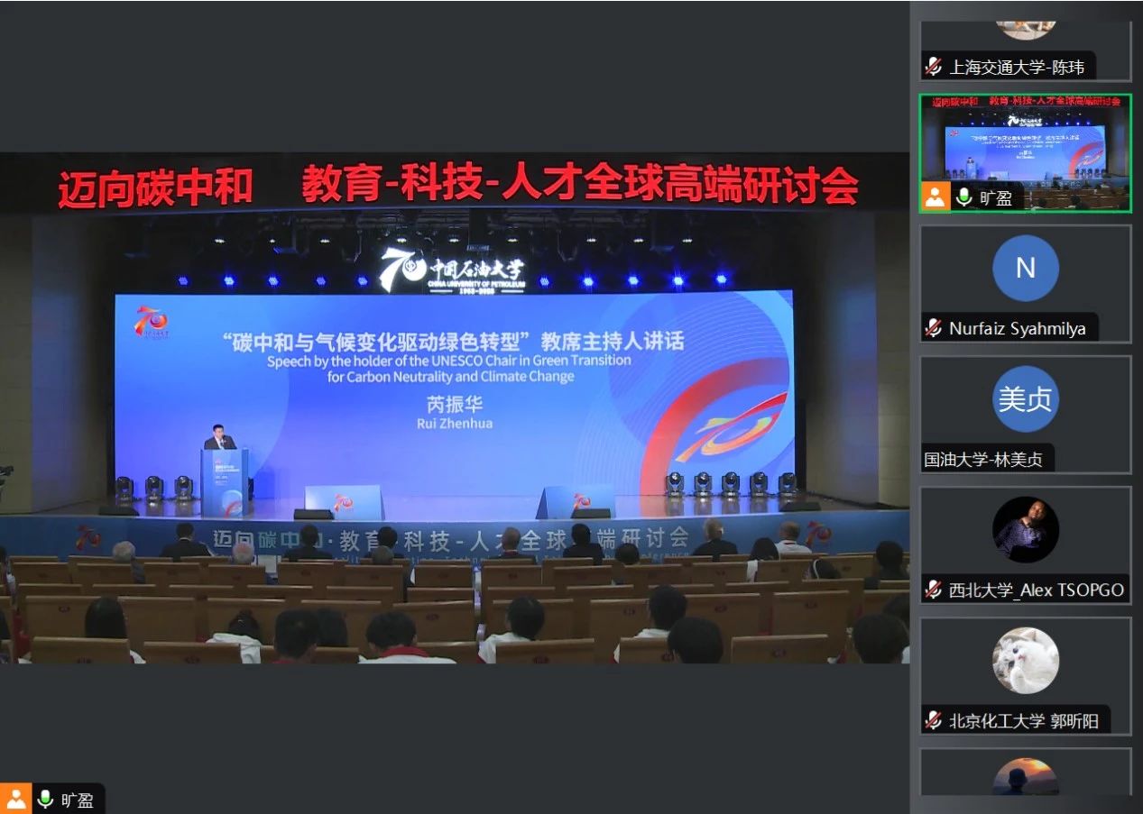 成立仪式上,中国石油大学(北京)碳中和未来技术学院副经理、联合国(UN)资源管理专家组成员芮振华作为“碳中和与气候变化驱动绿色转型”教席主持人讲话,指出了成立GCNG的重要意义;大会还颁发了全球碳中和与绿色发展青年大使及青年委员会席位证书,公司研究生秦志丹和公司职工TSOPGO ALEX GAUTIER受聘全球碳中和与绿色发展青年大使。